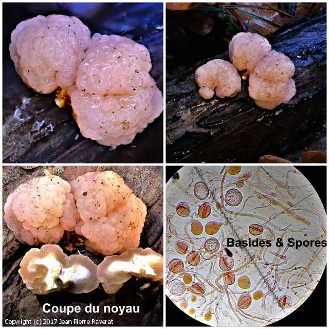 Sphériques ou largement elliptiques, lisses, hyalines, parfois avec de petites guttules pourvues souvent d'un mucron obtus, très distinct, germant sur le côté, 10-12 x 7,5-9 µm. I-. Hypobasides arrondies, septées longitudinalement, avec 2 longues épibasides, 13-20 x 13-18 µm. Hyphes de la couche gélatineuse larges, 1,5-2,5 µm, septées et cloisonnées. Hyphes du noyau larges de 2,5-4 µm, à parois épaisses, cloisonnées, non bouclées.