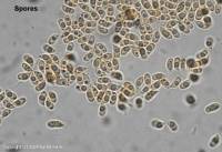 Oblongues-cylindriques, déprimées latéralement et obliquement atténuées à la base, lisses, 3,5-4,5 x 2-2,5 µm. J-. Basides claviformes, 4 stérigmates, 15-18 x 4-6 µm, rétrécies à la base. Pas de cystide. Monomitique : Hyphes hyalines, à parois minces, parfois ramifiées, bouclées, 2,5-5,5 µm.