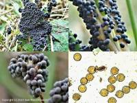 Verruqueuses ou spinuleuses, globuleuses ou subglobuleuses, brun-jaune clair, rarement en petits groupes, 9-10,5(11) µm, finement et peu densément spinuleuses.
