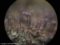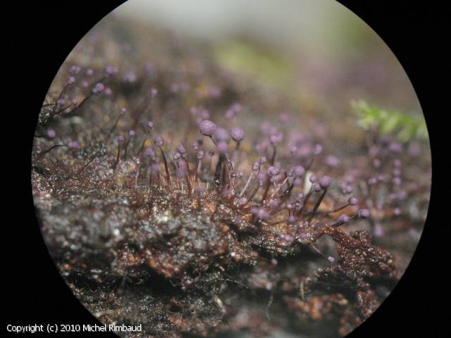 Stipe violet foncé, mesurant de 6 à 10 fois le diamètre du sporocyste.