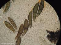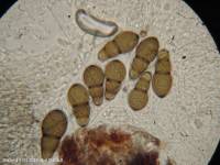 31-42 x 13-17 µm, brunes, 2 à 3 septées avec enveloppe gélatineuse de 2 à 4 µm d'épaisseur.