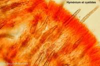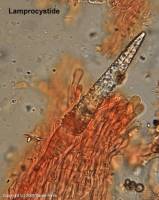 Cylindriques-elliptiques, 7-10(-12) x 3,5-5 µm, lisses, hyalines, guttulées ou avec quelques granulations, déprimées latéralement, blanches en masse. Basides étroitement clavées, subumiformes, 25-35 x 7-10 µm tétrasporiques, bouclées, avec quelquefois des cloisons secondaires. Lamprocystides nombreuses, fusiformes, à parois épaisses, incrustées, 80-100 x 10-17 µm. Monomitique. Hyphes à parois minces ou épaissies, larges de 2,5-5 µm, cloisonnées, bouclées.