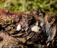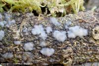 Erompant, verruciforme, 2-5 mm, céracé ou charnu trémelleux, blanchâtre, puis grisonnant ou noicissant, aplati et sublobé.