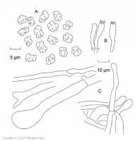 Très petites, arrondies à allongées, ornées de bosses obtuses, larges, brunes, 4,5-6 x 3-4,5 µm, ornementations comprises. Basides étroitement clavées, 23-33 x 5,5-7,5 µm, tétrasporiques, bouclées. Pas de cystide. Monomitique : Hyphes du sous-hyménium larges de 2,5-3 µm, celles de la chair pileique atteignant 14 µm, parfois enflées; toutes les cloisons sont pourvues de boucles.