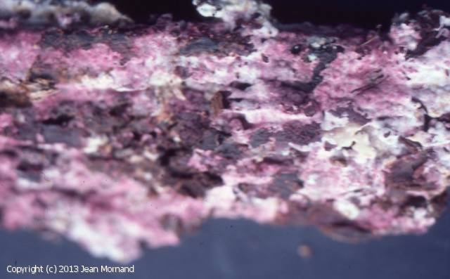 Violettes, amygdaliformes, à parois épaisses, lisses, uniguttulées, 6-8-9 x 3-4-4,5 µm. I+ ( peu visible ). Basides étroitement clavées, 18-27-30 x 6-7-9 µm, à 2-4 stérigmates longs de 3-4 µm, non bouclées. Monomitique : Hyphes à parois minces ou épaissies, les basiliaires lilas pâle,cloisonnées, non bouclées, les subhyméniales plus claires, souvent incrustées : hyménium composé de basides et de cystidioles courtes, obtuses ou allongées, émergentes, pouvant atteindre 80 x 5-7 µm, fréquemment aspérulées de cristaux.