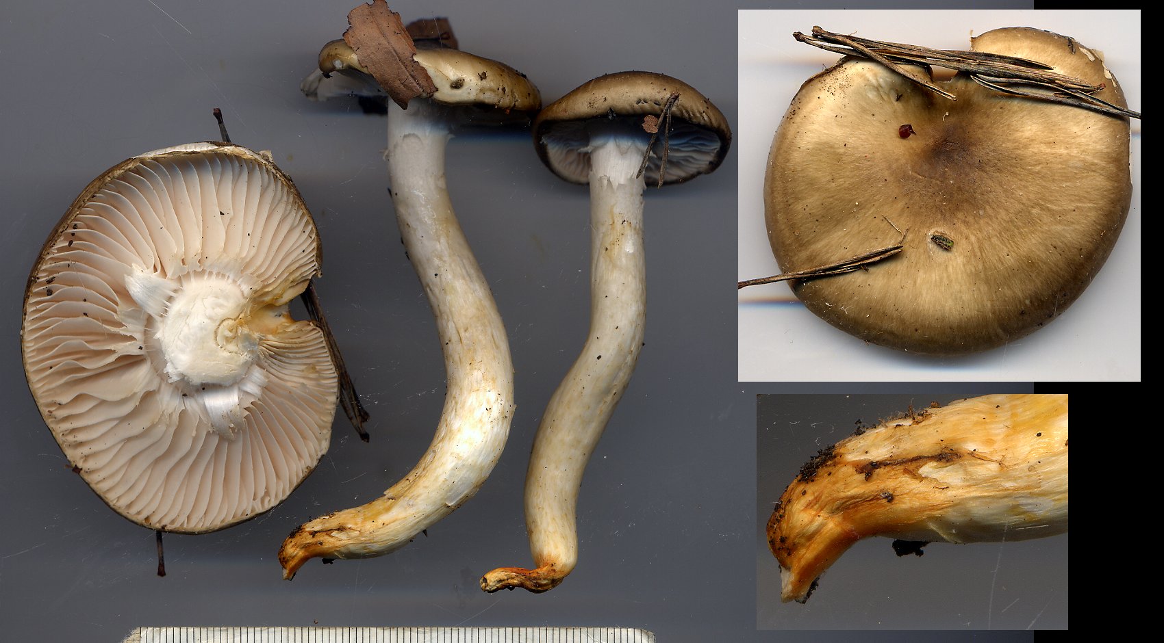Bonjour, ci jointe la photo d'un hygrophore trouvé dans une foret sur calcaire de pins sylvestres mêlés à des feuillus (Bugey), et que je rapproche d'Hygrophorus olivaceoalbus sans être complètement convaincu. Ce qui m'étonne c'est la présence de couleur orangé vif à la base du pied, qui n'est pas signalée dans la documentation dont je dispose. Autres caractères : Spores 6,5 x 12 µm. NH3 nul sur le chapeau et sur le pied.