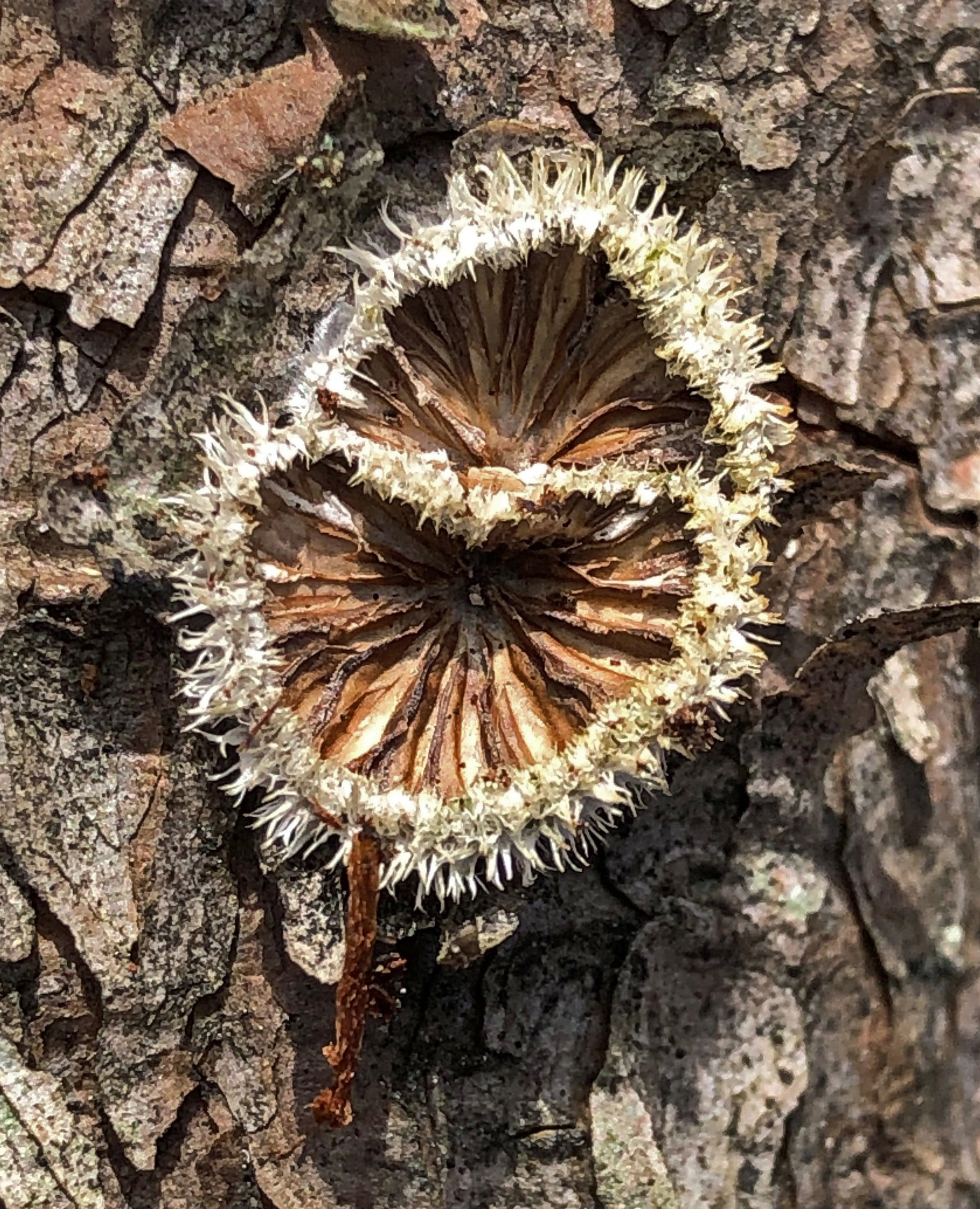 Bonjour, Schizophyllum commune pour ces spécimen poussant entre les écorces détachées d'un pin ? Ce n'est pas la forme – en cuillère simple et nervures saillantes au dessous – sous laquelle je le rencontre d'habitude… D'où le doute. Merci !