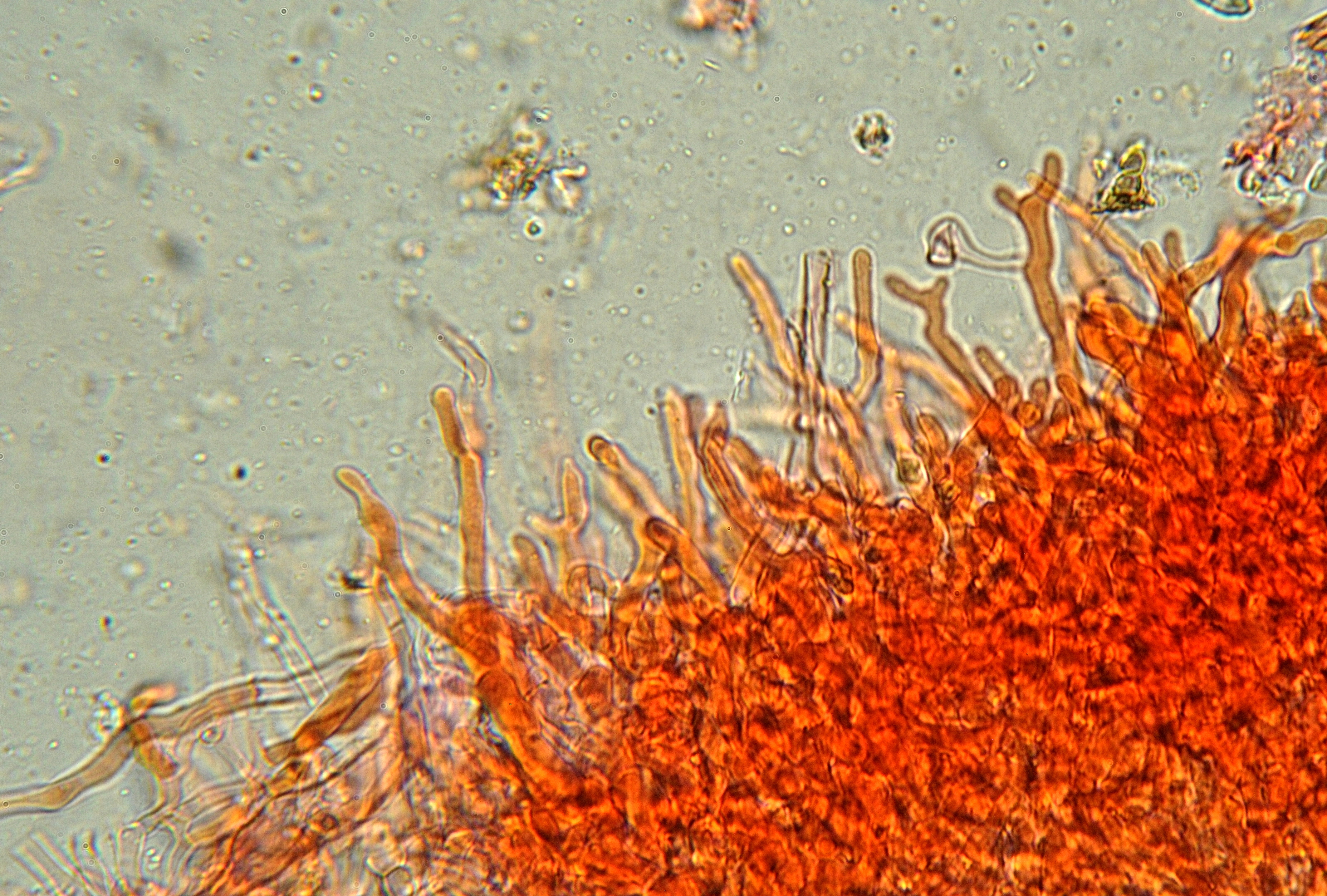 Bonsoir, Voici de nouvelles photos de l'hyménium. Sur les photos précédentes, les basides paraissaient courtes car je n'avais pas écrasé la préparation pour avoir encore des spores sur les stérigmates. J'en ai refais une autre où l'on distingue bien une baside (env. 80 x 5-6 µm), des hyphes capitées et des hyphes dendroïdes. J'ai à nouveau bien regardé les hyphes: je n'ai vu aucune boucle. Et je reste toujours plutôt sur un dendrothele (énigmatique) qui aurait des spores ocres?... A part Eriksson, je n'ai pas de clé pour aller plus loin!...