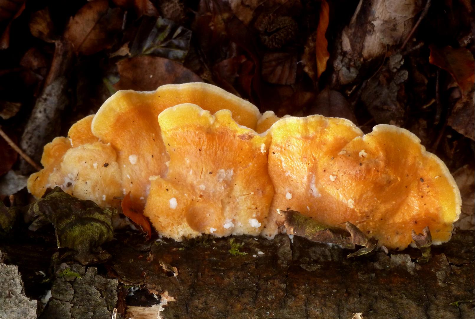 Sur une branche de feuillus tombée au sol, dans une forêt surtout de feuillus avec quelques épicéas à cet endroit, près de Compiègne.