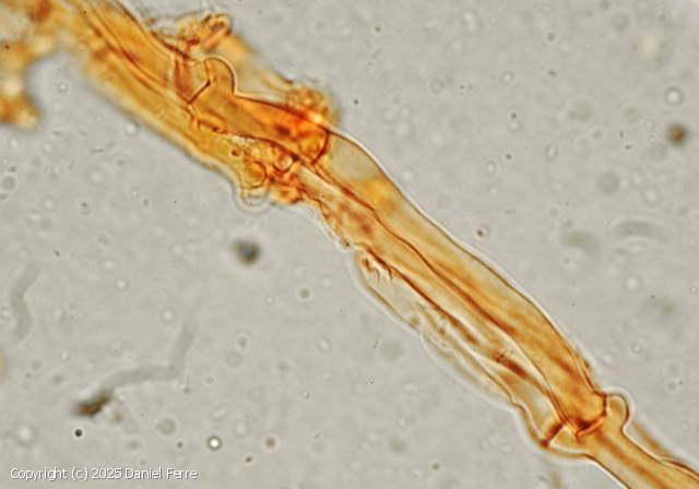 Globuleuses, hyalines, lisses, à paroi épaisse, I-, 3,5-5 x 3-4 µm, cyanophiles. Basides +- cylindriques, tétrasporiques, bouclées, 16-24 x 5-6,5 µm. Pas de cystides. Monomitique: Hyphes à paroi mince, courtement ramifiées, larges de 2 à 6 µm, cloisonnées, bouclées.