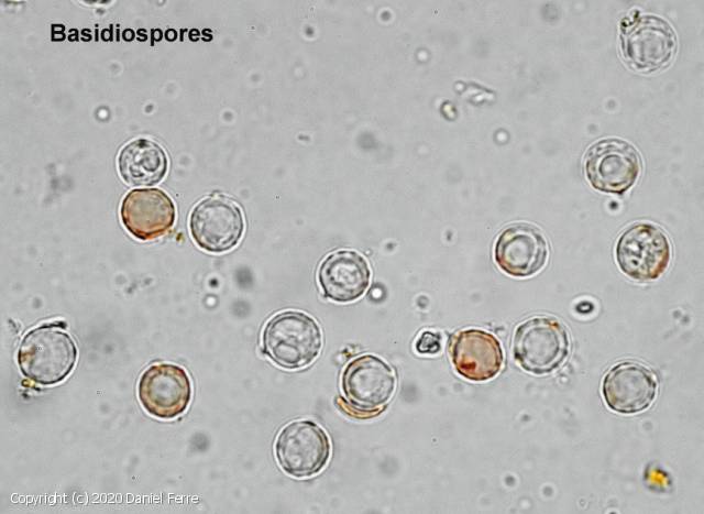 (1)- Basidiospores arrondies, finement ruguleuses, hyalines, à parois épaisses, guttulées, 5-6-10 x 5-6-9 µm, cyanophiles. (2)- Chlamydospores elliptiques, lisses, à parois épaisses, guttulées, parfois en germination, 9-10 x 5,5-6 µm, cyanophiles. Basides cylindriques clavées, un peu sinueuses, les fertiles émergentes, à 2-4 stérigmates, bouclées. Monomitique : Hyphes à parois minces, septées-noduleuses, distinctes à la base, mais promptement collapses en trame spongieuse sous l'hyménium, bouclées.