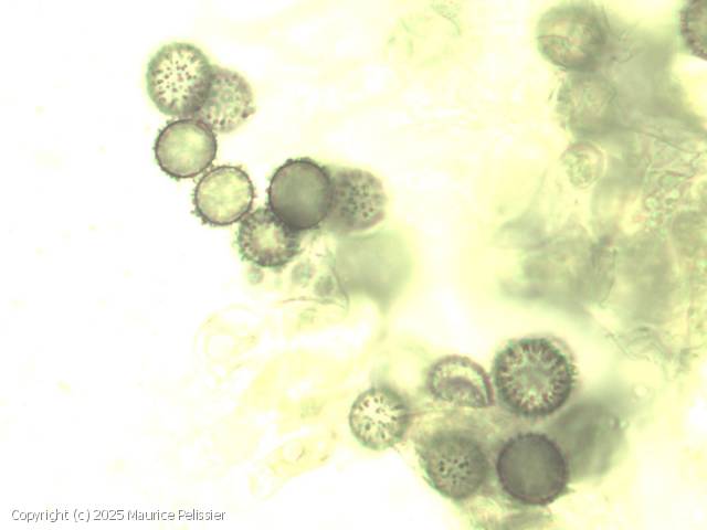 spores ovoïdes pourvues d'épines amyloides (9.76) – 10.04 – 12.72 – (14.4) X (8.96) – 9.57 – 10.56 – (11.97) moyenne 11.41 x 10.29