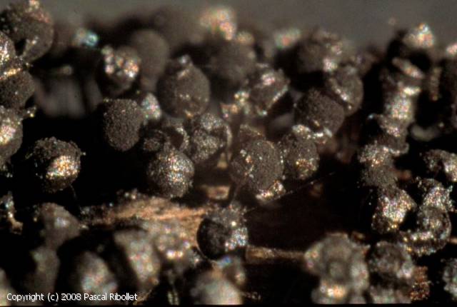 Capillitium brun foncé, dense, à filaments ramifiés et anastomosés ondulés en boucles, emmêlés.