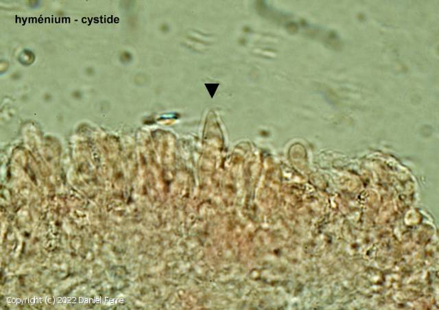 Elliopsoïdes, à peine déprimées latéralement, lisses, hyalines, 4-56,5- x 2-3 µm, avec 1 ou 2 guttules. I-. Basides étroitement clavées, tétrasporiques, 9-15-20 x 3-4,5 µm, accompaneés de cystidioles surtout vers l'extrémité des aiguillons. Cystides fusiformes, 20-25 x 4 µm, peu visibles. Cystidioles à parois minces, fusoïdes. Monomitique : Hyphes larges 1,5-3,5 µm, à parois minces, partiellement bouclées aux cloisons, les axiles serrées parallèles, émergentes en faisceau stérile à l'extrémité des aiguillons où elles sont insensiblement renflées, 4,5-6 µm, et aspérulées de cristaux prismatiques ; les subhyméniales sinueuses, en trame granuleuse peu distincte.