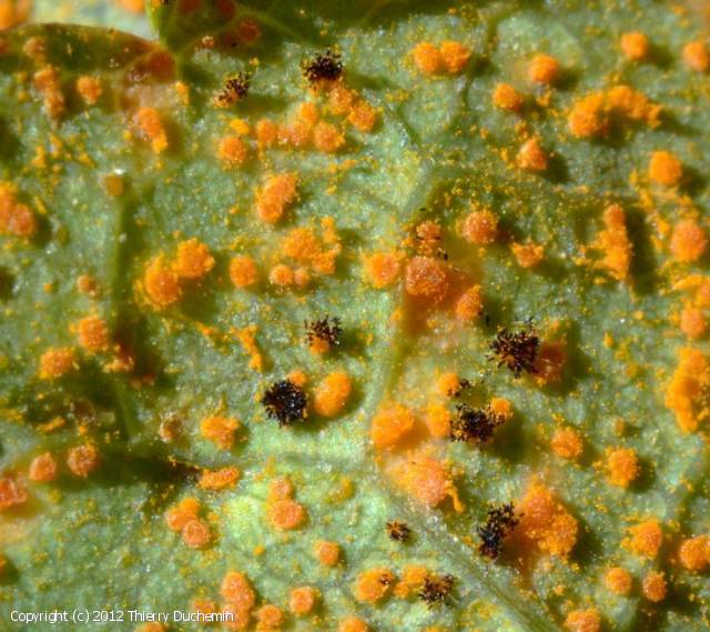 Ecidies plus ou moins bien formées. Urédosores jaune pâle ou jaune orangé, avec des paraphyses courbes. Spores grossièrement échinulées, avec de larges pores d'environ 4-5 µm de diamètre, 20-27 x 18-24 µm. Téleutospores noir. Spores 60-110 x 30-35 µm, septées, 4- à 5 cloisons.