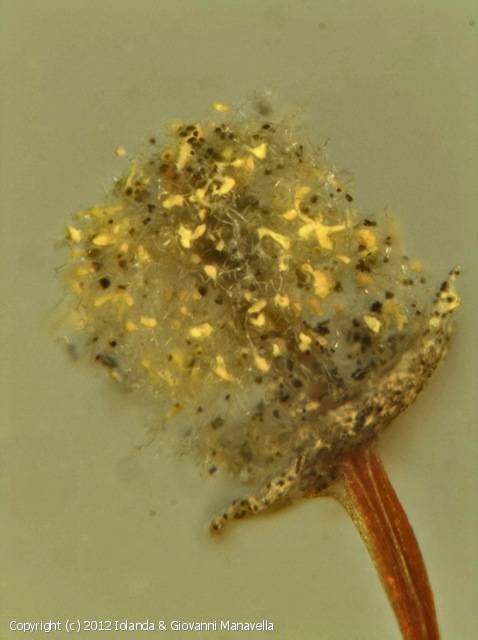 Spores verruqueuses avec des groupes de verrues plus foncées, mesurant de 5,5 à 7,5μm de diamètre.
