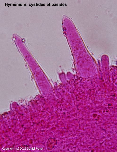 Cuticule hyméniforme à cellules piriformes brunâtres à paroi épaissie non bouclées, mêlées à des dermatocystides étroitement fiusiformes.