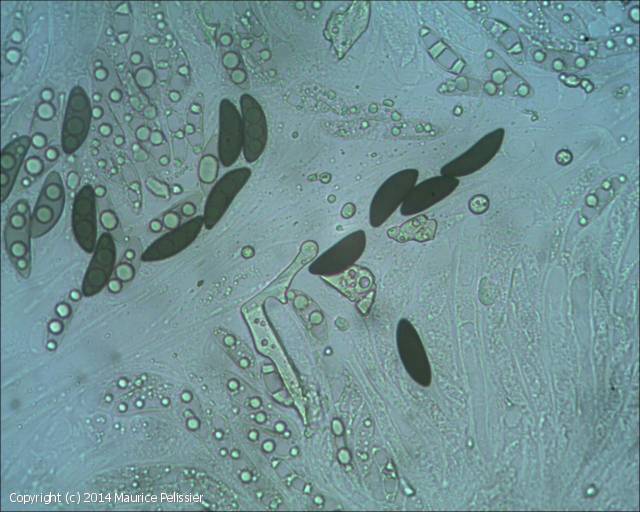 Brunes, arquées ellipsoïdes, asymétriques, 2 a 3 guttules jeunes, 19,4–24,2-(26,7) x 6,1-7,3-(8,5) µm.