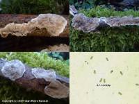 Thelephora carnosa Ehrenberg (1818), Sylvae mycologicae berolinenses, p. 18, 30 Thelephora epidermea Persoon (1822), Mycologia europaea, seu complet omnium fungorum in variis europaeae regionibus detectorum enumeratio, 1, p. 136 Thelephora decorticans Persoon (1822), Mycologia europaea, seu complet omnium fungorum in variis europaeae regionibus detectorum enumeratio, 1, p. 137 Radulum botrytes Fries (1828), Elenchus fungorum, sistens commentarium in systema mycologicum, 1, p. 152 Thelephora decorticans tricolor Secretan (1833), Mycographie Suisse, 3, p. 217 (nom. inval.) Corticium comedens (Nees) Fries (1838) [1836-38], Epicrisis systematis mycologici, p. 565 Corticium botrytes (Fries) Quelet (1888), Flore mycologique de la France et des pays limitrophes, p. 5 Corticium comedens var. botrytes (Fries) Quelet (1888), Flore mycologique de la France et des pays limitrophes, p. 5 Corticium carlylei Massee (1890) [1891], The journal of the linnean Society, botany, 27(182), p. 148 Terana comedens (Nees) Kuntze (1891), Revisio generum plantarum, 2, p. 872 color='red'> color='red'>Vuilleminia comedens (Nees) Maire (1902), Bulletin de la Societe mycologique de France, 18(4), supplement p. 81 (nom actuel) References : Bon p. 323 ; BK 2 217 Groupe : Croutes Classification : Basidiomycota / Agaricomycetes / Corticiales / Vuilleminiaceae Chapeau/Fructification : Entierement resupinee formant des surfaces de plusieurs decimetres de diametre. Surface hymeniale plus ou moins lisse, mate-lardacee-brillante par hydratation, blanchatre a faiblement carnee ou grisatre et teintee de lilas, souvent tachee. Chair : Gelatineuse-ceracee, visqueuse au toucher, parfois feutree-blanchatre a la marge, chez les vieux exemplaires. Habitat : Sur bois mort decortique, branches tombees, ou encore a l'arbre, egalement sur troncs, tout particulierement de Quercus, mais aussi de Corylus, d'Alnus. Spores : Cylindriques, legerement arquees, lisses, hyalines, parfois guttulees, 15-19 x 5,5-6µm. Basides, grandes, etroitement clavees 100 x 12µm, pourvues de 4 sterigmates, egalement bisporiques occasionnellement. Hyphes larges 1,5µm, cloisonnees et bouclees. Comestibilite : Sans interet Commentaires : Palissant a l'etat sec. L'ecorce des branches et troncs colonises se detache et s'enroule de maniere typique. Tout au long de l'annee, mais surtout en automne et en hiver. Frequent. |