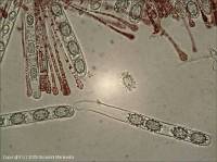 Lachnea crucipila (Cooke & W. Phillips) Gillet (1886), Champignons de France, les discomycetes, p. 214 Neottiella crucipila (Cooke & W. Phillips) Saccardo (1889), Sylloge fungorum omnium hucusque cognitorum, 8, p. 192 Ciliaria crucipila (Cooke & W. Phillips) Boudier (1907), Histoire et classification des discomycetes d'Europe, p. 62 Cheilymenia calvescens Boudier (1907), Histoire et classification des discomycetes d'Europe, p. 63 Lachnea calvescens (Boudier) Saccardo & Trotter (1913), Sylloge fungorum omnium hucusque cognitorum, 22, p. 633 Patella crucipila (Cooke & W. Phillips) Seaver (1928), The North American cup-fungi (operculates), p. 168 Humaria stellata Kanouse (1948) [1947], Mycologia, 39(6), p. 657 Humaria crucipila (Cooke & W. Phillips) Kanouse (1948) [1947], Mycologia, 39(6), p. 655 Cheilymenia crucipila (Cooke & W. Phillips) Le Gal (1953), Prodrome a une flore mycologique de Madagascar et Dependances, 4, p. 111 (nom actuel) Scutellinia crucipila (Cooke & W. Phillips) J. Moravec (1984), Ceska mykologie, 38(3), p. 149 References : BK 1 85 ; Dennis p. 41 fig. VIj ; Cetto 4 1652 ; Gr. p. 158 n° 244 Groupe : Pezizes Classification : Ascomycota / Pezizomycetes / Pezizales / Pyronemataceae Chapeau/Fructification : Receptacle sessile, charnu, hemispherique, cupule au debut, puis plan, 2-8 (-10) mm, reposant directement sur le substrat. Hymenium rouge vif ou orange en dessus, surface externe plus claire ou plus pale et garnie de poils brun clair lachement enchevetres et peu apparents. Habitat : Sur terre nue et humide, au bord des chemins, dans les ornieres et parmi les plantes herbacees, egalement croissant sur le terreau. Spores : Elliptiques-oblongues, hyalines, lisses, non guttulees, finement ponctuees-verruqueuses, ornementations renflees par des cretes. Asques cylindriques, octospores, 240 x 10 µm. Paraphyses cylindriques, epaissies en clavule au sommet, jusqu'a 10 µm, et remplies de granulations rougatres, septees et fourchues. Poils brunatres, plus ou moins colores, simples, fourchus ou en forme de croix, septes, longs de 100-200(jusqu'a 280 )µm, et larges de 7-10 µm. Poils de la base ramifies en 2 a 5 branches. Comestibilite : Sans interet Commentaires : Isole a gregaires, surtout en croissance serree. Repandu ou rare. Ete-automne. Remarques : Souvent en croissance avec Scutellinia scutellata. |